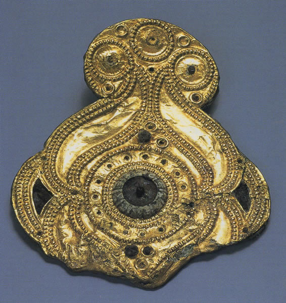 ブロンズの板の上に金を被せている。中心にあった珊瑚の左右にロートス文を置き、その先の三つの円はパルメツトを意図している。珊瑚または琥珀の粒を鉄の釘で留めていた穴が随所に残っている。1904年に墳丘で発見され、エトルリアのブロンズ製嘴壷、鞘に収めた剣、槍の穂先、別の装飾板などを伴出した。出所:「古代ヨーロッパの至宝--ゲルト美術展1998」