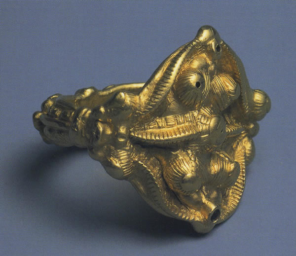 大きな装飾面はほぼ菱形をなし、垂直の細かい線形を入れた枠で囲まれている。枠の稜線の内側と、輪の延長線上の稜線の両側には、籠細工状の線形を施すこれらに囲まれた三角形部分には互いに反対方向を向く渦文があり、そこに施された線形の方向が途中で変わっている。輪にも連続渦文、籠細工状線形、互いに反対方向を向く渦文などを並べている。線形を施した渦文と籠細工状線形はパネンスキー・ティーネツのフィブラと共通するモチーフである。出所:「古代ヨーロッパの至宝--ゲルト美術展1998」