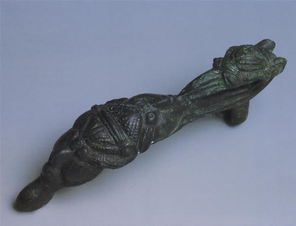 足にグリュプスを象り、弓には互いに反対方向を向く二つの顔を表す。バネに近い方では長い眉の先が渦文になっている。もう一つの顔には動物の尖った耳がある。これらの顔は、エトルリアのブロンズ容器の把手の取付部に表されたサテュロス、シーレーノスまたはアケロオスの顔がもとになっている。出所:「古代ヨーロッパの至宝--ゲルト美術展1998」