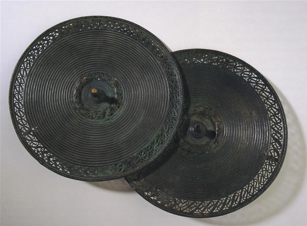 車葬墓で発見された。それぞれより大きな円盤に取り付けられ、二頭の馬のむながいを装飾していたと考えられる。中央に珊瑚を嵌入し、表面を同心円状に六つに区画し、ニカ所に透かし細工の文様を展開している。内側の透かし装飾はS字連続文。外側はS字対向リュラー文とランニング・ドッグの交替で、二種の文様の自然な移行が見事である。外側の透かし装飾は二つの円盤の間で一見同じに見えるが、文様の間隔と、二種の文様の割合が異なり、さらにランニング・ドッグは同じ方向に走るが、S字対向文は方向が逆になっている。出所:「古代ヨーロッパの至宝--ゲルト美術展1998」