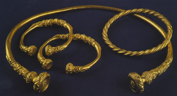 中は空洞で、七つまたは八つの部品を溶着している。端末とそれに近い輪の部分に文様を施し、それぞれの装飾帯を連珠文で区画する。輪の部分には二枚に重なったリュラー文とパルメット文があり、その間に星形花文とトランペット文を配するが、これは疑いなく、ターラント製ワイン容器の把手の取付部の文様をケルトの様式感覚で再構成したものである。その他の部分の装飾は渦文・葉文、およびそれを組み合わせた唐草文である。着用による磨滅が認められる。出所:「古代ヨーロッパの至宝-ゲルト美術展1998」