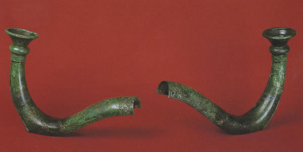 一対 Pair of yoke terminals ヴァルダルゲスハイム,ラインラント,ドイツ ブロンズ,長さ22.9cm,23.4cm ラ・テーヌBI/2期 ボン,ライン州立博物館A 785, 18; 19 大小二枚の板を鋲で留め、鋳造による端末の握り部分を上からはめ込んでいる。くびきの中央部に近い端に唐草文の装飾帯をたがねで彫り出す。 関連用語: