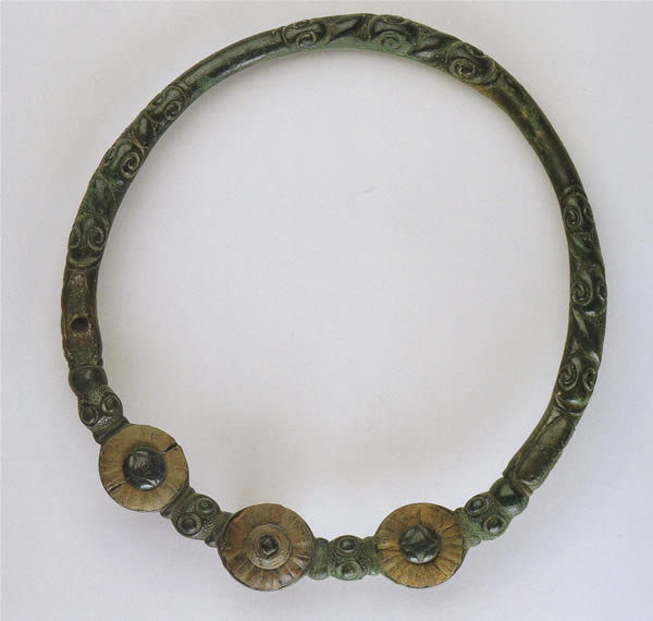 前に来る位置に赤エマーユの円盤を三つ取り付け、鋲で留め、その間と左右、および輪の三ヵ所に装飾を施している。出所:「古代ヨーロッパの至宝--ゲルト美術展1998」