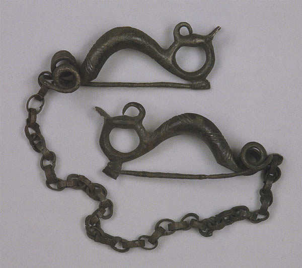 鎖で繋がった二つのフィブラの針止めの上部が、後ろを振り返る動物の頭部になっている。初期ケルト美術のフィブラから影響を受けながら、動物は龍またはグリュプスになっており、鞘に見る向かい合う龍のモチーフと関連する。アーチ部には幾何学文を刻んでいる。出所:「古代ヨーロッパの至宝--ゲルト美術展1998」