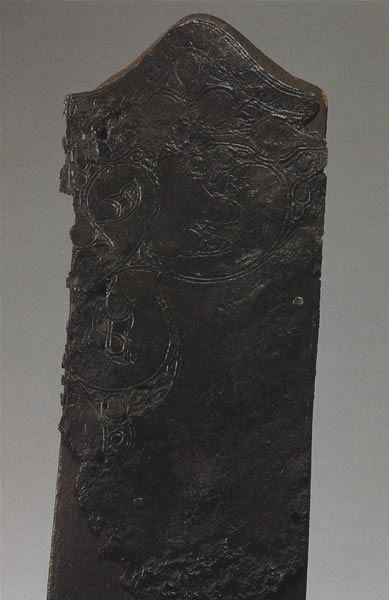 鞘の裏面は失われた。表側の上部の斜め構図の装飾には、植物文に由来するモチーフの幾何学化が認められる。蔓によって枠取られた空間が8の字形、トリスケーレなどで充填され、空所には点が三つまたは一つずつちりばめられている。同じ特徴を有するブルチケ・マドチヤヘギュ出土の別の鞘も同一の作者の