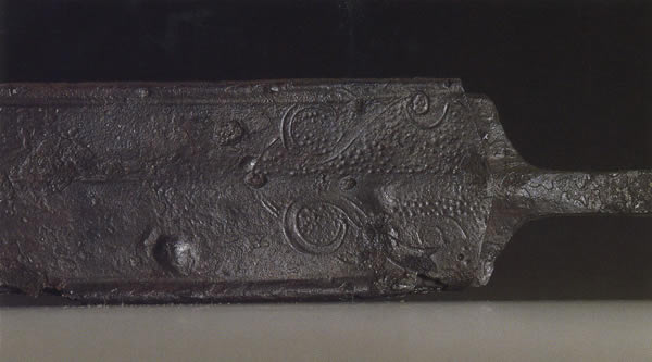 古い鞘に新たに装飾を加えている。鞘の表側の上部に動物リュラー文を表す。裏側では斜めに区画した三ヵ所の装飾帯にヴァルダルゲスハイム・タイプの連続トリスケーレ唐草文を配する。唐草文はアンコーナに近いモスカーノ・ディ・ファブリアーノ、およびボローニヤ近郊のモンテ・ビーベレ出土の鞘と比較され、北イタリアのセノネース族から伝えられたモチーフと推定される。この装飾の年代である紀元前3世紀初頭は、北イタリアからダ二ューブ流域へとケルト美術の重心が移行しつつある時期にあたる。出所:「古代ヨーロッパの至宝--ゲルト美術展1998」