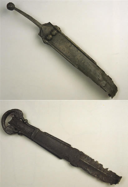 柄の先端に人の頭部を表す鞘の表側の上部の二つのメダイヨンにS字渦巻文を、その両脇に葉文を、立体様式で表すメダイヨンの上にはパルメットから派生した「線形を施した三角葉文」を彫っている。刀剣様式と立体様式が同一物に適用された重要な作品である。出所:「古代ヨーロッパの至宝--ゲルト美術展1998」