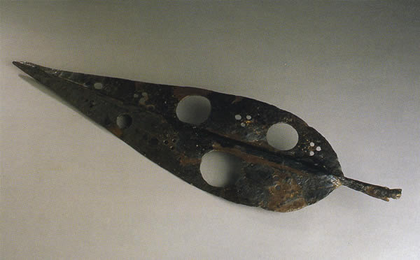 大きな穴が五つと、小さな穴が三つずつ六ヵ所に空いている。穂先の大きさに比べ柄つぽが短く細いことから、おそらく本来の武器ではなく軍徽章として使われたと推定される。土葬男性墓から他の武具一式、鞘に収められた剣、剣を吊すためのベルトの鎖、および盾とともに出土した。強いて類例を探すならオーストリアとハンガリーのものがある。出所:「古代ヨーロッパの至宝--ゲルト美術展1998」
