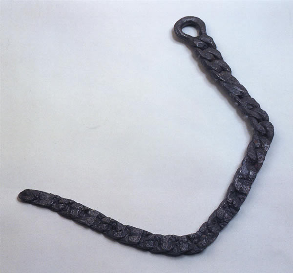 Belt chain ポニェトヴィツェ第14墓,モラヴィア,チェコ 鉄,長さ5.35cm,重さ4259 紀元前2世紀 ブルノ,モラヴィア博物館 鎖の一端には留めるための鉤を、他の端には皮紐を通すための輪を付けている。出所:「古代ヨーロッパの至宝--ゲルト美術展1998」 関連用語: