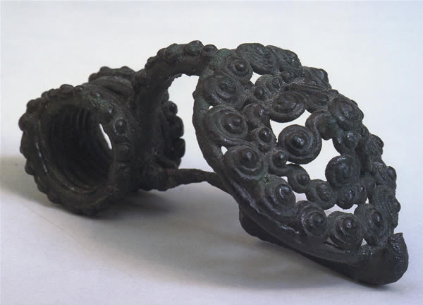 基部と呼ばれる大きな円盤部分に擬似絹綿細工で多数の螺旋文を装飾している。弓とコイル部分にも同じ技術が適用されている。擬似絹綿細工はカルパチア盆地の特徴であり、この技術がモラヴィアにも伝えられたことを本例は示している.出所:「古代ヨーロッパの至宝--ゲルト美術展1998」