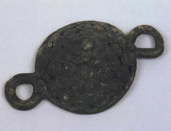 透かし鋳造でS字渦巻文をモチーフとする絹綿細工の効果を意図し、全体として円錐形を構成している。擬似銅線細工を適用した留め余類は、南モラヴィアやスロヴァキア、ハンガリー、ユーゴ、ルーマニアから出土し、東南から北西へと伝播したと推定されている。出所:「古代ヨーロッパの至宝--ゲルト美術展1998」