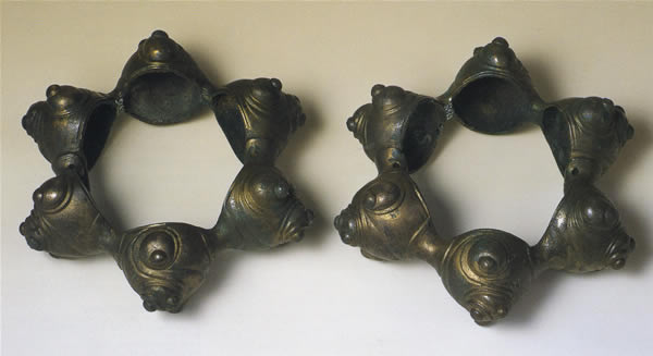 六つの中空の半球形からなっている。半球形には縦にS字二つを連ね、中央に横にS字を配して陰陽文を作っている。半球形からさらに二段階の塊りが突き出している。 1896年に発見された土葬墓からは、このほかに七つの中空の半球形からなるアンクレット1点も出土した。出所:「古代ヨーロッパの至宝--ゲルト美術展1998」