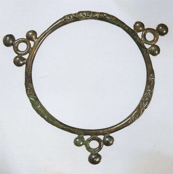 失蝋法によって鋳造されている。輪の周りに同一の立体的な装飾を三度繰り返すそれぞれ三つの珠を伴う輪である。その間に等間隔に浅浮彫で、互いに顎をつけて向き合う二つの顔を表す顔の両側にS字が伸び、先はパルメットになっている。この形式はセーヌ川とヨンヌ川に挟まれた地域の女性用トルクの特徴である。出所:「古代ヨーロッパの至宝--ゲルト美術展1998」