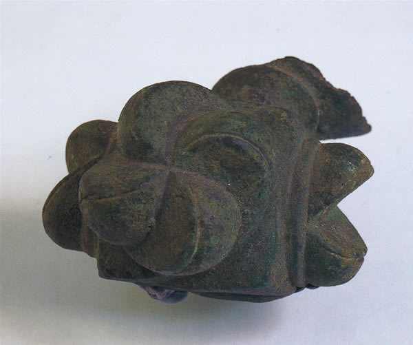 Fragment of anklet ウフジツェ,モラヴィア,チェコ 鋳造ブロンズ,幅6cm,重さ130g 紀元前3世紀 ブルノ,モラヴィア博物館 鋳造ブロンズによるアンクレットの、中空の塊り一つだけが残っている。主要モチーフは羽根四枚のかざぐるまである。出所:「古代ヨーロッパの至宝--ゲルト美術展1998」 関連用語: