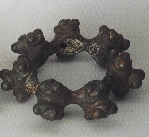 それぞれ中空の三つの塊りを備えた部品二つから構成されている。一つ一つの塊りにさらに三つの小さな塊りがある。内部に鋳造上が残存している。失蝋鋳造法は、全く同一ではないが基本的に同じ作品を多数制作することを可能にした。出所:「古代ヨーロッパの至宝--ゲルト美術展1998」