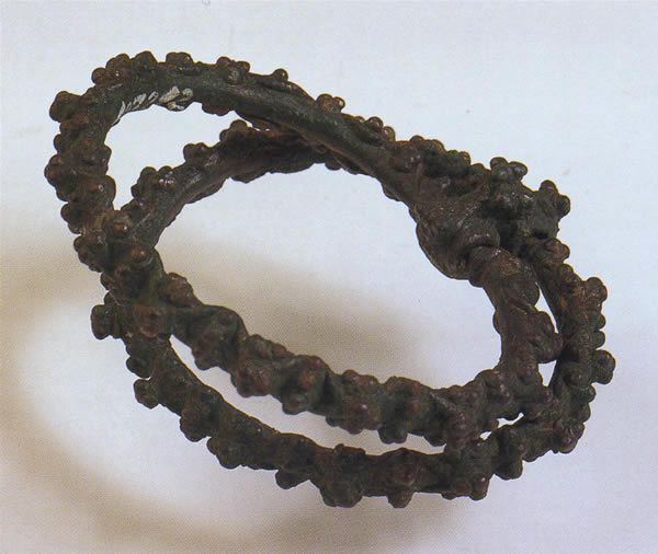 Double Openwork bracelet ブチョヴィツェ第14墓,モラヴィア,チェコ 鋳造ブロンズ,径7.7×5.8cm,重さ87g 紀元前3世紀 ブルノ,モラヴィア博物館 楕円形の二つの輪を一ヵ所で金具で繋ぎ、全面に擬似金粒細工によって装飾している。出所:「古代ヨーロッパの至宝--ゲルト美術展1998」 関連用語: