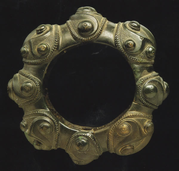 半分ずつ失蝋法で鋳造した後、接合している。周囲に中空の八つの塊りを配し、その間には滑らかな無装飾部分を反復する。大きな塊りと小さな塊りを交互させ、大きい方は二つのトリスケーレをS字で繋いでおり、この一組のトリスケーレは互いに方向が逆になっいる。小さい方は二つの連続S字の中央に、三つに分割した大きな半球形を置いている。トリスケーレとS字の末端は半球形をなし、その頂きに小さな円を装飾している。トリスケーレとS字は滑らかで稜をつけるだけだが、その地には細かい点刻を施しているため、滑らかな部分が光を反射しても点刻部分は影になり、光と影の対照が生じている。塊りの基部をめぐる無数の刻みもS字である。タルン川から発見され、川の神に奉納されたと考えられる。出所:「古代ヨーロッパの至宝--ゲルト美術展1998」
