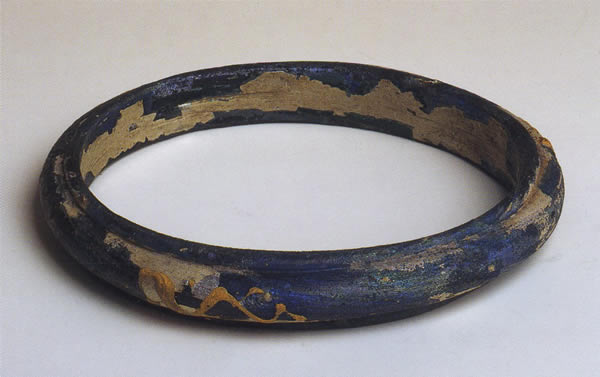 青色ガラスによる輪の周囲を水平に三つに分け、中央に黄色ガラスの線を交差させている。多少風化している。1888年に土葬墓で発見され、動物を象った鈎の付いたベルトの鎖の一一部、指輪などを伴出した。出所:「古代ヨーロッパの至宝--ゲルト美術展1998」