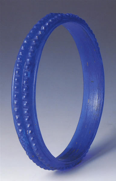 Bracdet トゥルスコ,プラハ・ザーパド,ボヘミア,チェコ ガラス,内径7.4cm,重さ26.39g 紀元前3世紀後半 プラハ,チェコ国立博物館 青色ガラスの腕輪の外周に小さな粒を二列に並べている。 1907年に発見された土葬墓からは他にもガラス製装身具が出土した。出所:「古代ヨーロッパの至宝--ゲルト美術展1998」 関連用語: