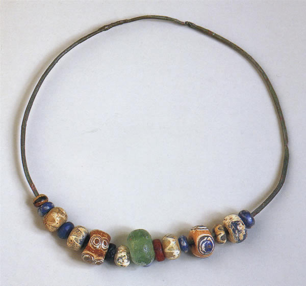 一本のブロンズ線に16個のガラス玉を通し、一ヵ所で駒形に曲げて留めている。色彩も大きさも様々なガラス玉の中には、地とは異なる色で目玉やジグザグ文をあしらったものもある。黄色い琥珀玉と黒玉による玉も一つずつ混じっている。出所:「古代ヨーロッパの至宝--ゲルト美術展1998」
