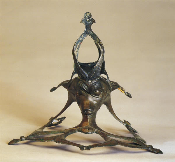 溝で囲まれた墓で発見され、重要な人物に副葬されたことが推定されるが、組織的な発掘が行われなかったため不明な点が多い。豊富な装飾部品とその形状によって、木で作られていた壷の形が復元されている。腹部の張った脚付きの壷で、円筒形の注ぎ口と垂直の把手があり、ぶだの上にはグリュプスが乗っていた(b)。腹部の両側面の装飾では、次々と繋がっていく渦巻の結節部に目が表されている(e、f)。注ぎ口の周りに装着された部品では、複雑な構成の中心に動物の顔が現れる(d)。把手の下には怪物の顔が表されている(c)。脚部にはパルメットを戴く三つの部品と、互いに向かい合わせになった二つの人間の顔を表した部品がある(a)。全体として植物文と人と動物の要素の融合が見事である。これらの表現の意味は明らかではなくとも、この容器が宗数的祭儀に使われたことは推測できる。出所:「古代ヨーロッパの至宝--ゲルト美術展1998」