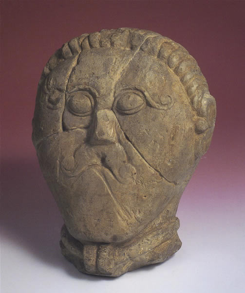 おそらく全身像であったが、頭部だけが五つに割れた状態で発見された。S字による眉、渦巻によるひげ、および丸く突き出た目、力強い顎、オールバックの髪型により、ケルト美術における顔の典型となっている。髪は頭頂部と項にだけ表され、あとは省略されている。もとは彩色が施されていたと想像される。 1943年に深さ80cmの溝から出土したが、近くには200mx105mの神域と神殿があった。トルクを着けていることと合わせ、一般に神の像と考えられている。南フランスのアントルモンとロックペルテユーズの神域から出土した、同じく等身大の頭部に比べ、本例における表現の線的性格と植物文は、より真正にケルトの造形の特徴を伝えている。オリジナルは移動不可能なため複製を展示する。ムシェツケー・ジェフロヴイツェの神域とその発見物に関する総合的研究は1998年に刊行される。出所:「古代ヨーロッパの至宝--ゲルト美術展1998」
