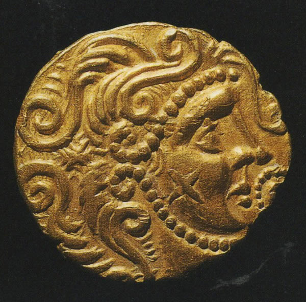 Gold coin (obverse) コンピエーニュオワーズ,フランス 金,径2.2cm,重さ7.25g パリーシー族,北フランス フランス国立図書館 スタテール、クラスI。表:右向きの人物頭部。連珠文が顔を取り巻く。頬に十字。裏:左向きの馬。前に十字、上に「三角形の網」、下に花文。出所:「古代ヨーロッパの至宝-ゲルト美術展1998」 関連用語: