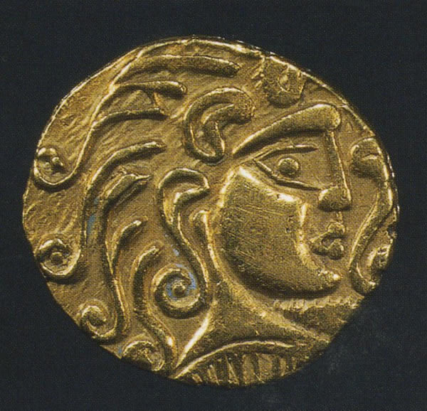 Gold coin (obverse) 不詳 金,径2.1cm,重さ7.30g パリーシー族,北フランス フランス国立図書館 スタテール、クラスII。表:右向きの人物頭部。顔の前に唐草文。裏:左向きの馬。上に「三角形の網」、下に花文。出所:「古代ヨーロッパの至宝-ゲルト美術展1998」 関連用語: