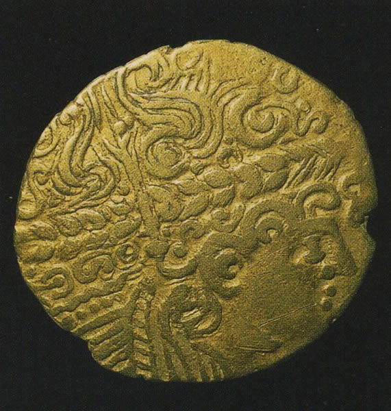 Gold coin (obverse) 不詳 金,径2.5cm,重さ7.62g アンビアーニー族,北フランス フランス国立図書館 スタテール、表面が広いタイプ、クラスlb。表:右向きの人物頭部。髪が表面の半分以上を占める。髪の中に斜めに一本の棒。裏:戦車に繋がれた馬が右向きに走る。上に御者、下に花文。 関連用語:
