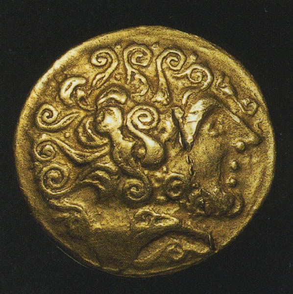 半スタテール、ひげのあるタイプ、クラスlb。表:右向きの人物頭部。ひげを伸ばしている。裏:御者の乗る戦車を牽いて馬が右に走る。前に麦の穂、下に逆向きの鳥と蛇。手本としたマケドェアのフィリッポスニ世の金貨から受け継いだフィリッポス銘の名残りが下段に認められる。