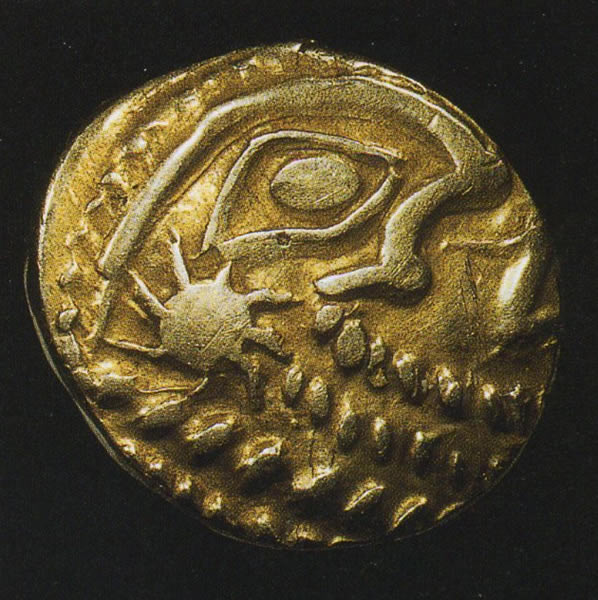 Gold coin (obverse) 不詳 金,径1.9cm,重さ5.88g ベロウァキー族,北フランス フランス国立図書館 スタテール、太陽タイプ、クラスII。表:右向きの人物頭部の解体。大きな目のそばに太陽文。裏:右向きの馬。上下に太陽文。出所:「古代ヨーロッパの至宝-ゲルト美術展1998」 関連用語: