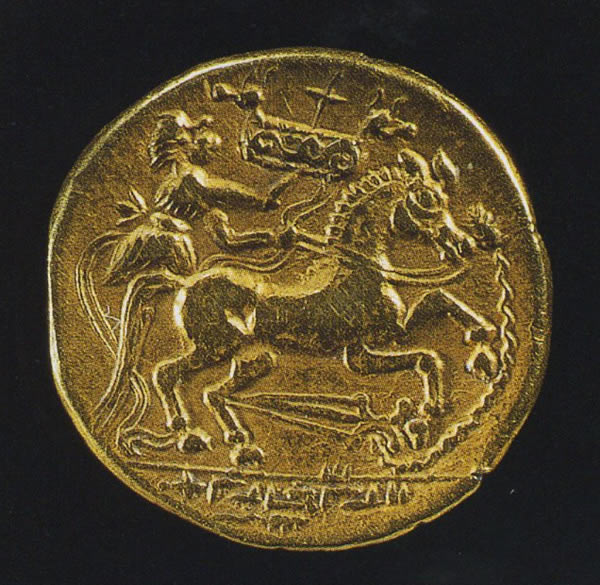 半スタテール。表:右向きの人物頭部。下に剣。裏:御者の駆る馬が右に走る。御者は船を持つ。舳先とは動物のプロトメ(上半身)。前に麦の穂、下に剣。地面の下に銘の名残り。出所:「古代ヨーロッパの至宝-ゲルト美術展1998」