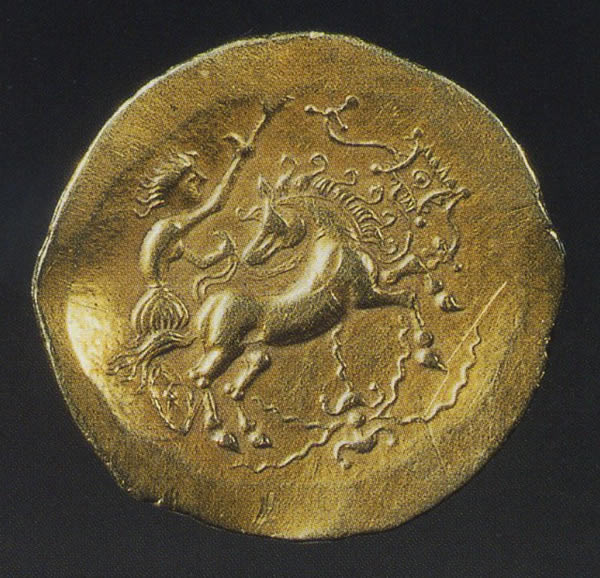 タテール。表:右向きの人物頭部。月桂冠を着ける。裏:女御者の乗る戦車を牽いて馬が右向きに走る。馬は後ろを振り返る。女御者の持つ木の枝は前方で投げ道具になっている。馬の下に雷霆。出所:「古代ヨーロッパの至宝-ゲルト美術展1998」