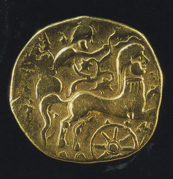 スタテール。表:右向きの人物頭部。頭上にイノシシ。周りに連珠文で繋がった切られた首四つ。裏:人間の顔の馬が右に走る。唐草文を手にした女御者。下に車輪文。出所:「古代ヨーロッパの至宝-ゲルト美術展1998」