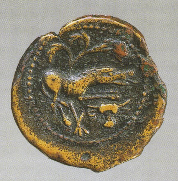 Coin(reverse) 不詳 ブロンズ、径1.6cm,重さ1.62g ピクトネース族,西フランス フランス国立図書館 CONTOVTOS銘のあるタイプ。表:CONTOVTOS銘。右向きの人物頭部。裏:本の下に右向きのオオカミ。下に牛の頭蓋骨(ブクラーニオン)。出所:「古代ヨーロッパの至宝-ゲルト美術展1998」 関連用語:
