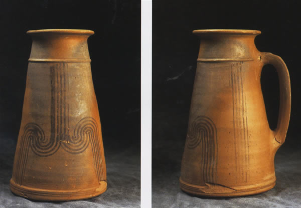 水差しの側面に、平行線が直線と曲線を描く幾何学文を黒で装飾している。1913年の発掘で、第13街区第32室から出土した。出所:「古代ヨーロッパの至宝-ゲルト美術展1998」
