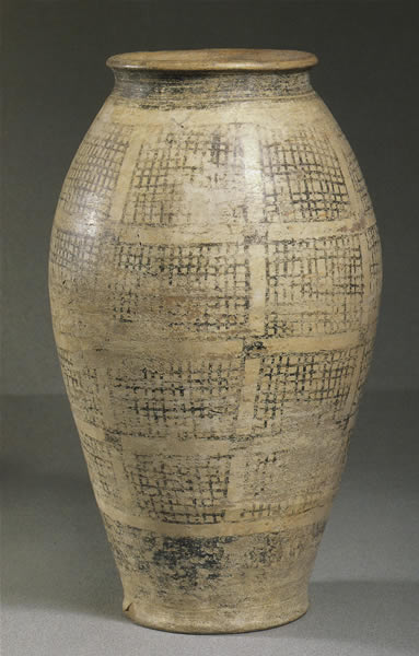 回転の速いろくろを使って制作された。赤色粘土に象牙白色の泥漿をかけ、その上に黒で格子文を描く。目縁録部と脚部を黒で塗りつぶし、細かい格子文は縦七本、横五本の白帯によって区画している。1806年に火葬墓から出土した。出所:「古代ヨーロッパの至宝-ゲルト美術展1998」