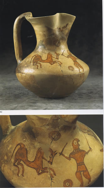 1908年発見。三葉形の注ぎ口のある水差しの肩部に、二頭の馬を調教する男を描いている。調教師は右手で鞭を、左手で馬につけた手綱を握っており、その左方ではもう一頭の馬が飛び跳ねている。空所に同心円と三日月形をちりばめている。ヌマンティア(古代名)にはケルト・イベリア人が住んでいたが、紀元前133年にローマによって破壊され、その後、前1世紀初め頃から復興されて、独特の多彩色土器が制作された。出所:「古代ヨーロッパの至宝-ゲルト美術展1998」