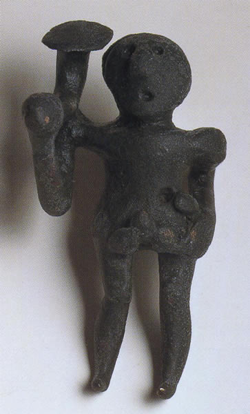 戦場で使われたケルトのトランペット、カルニュクスを右肩に担いでいる。トランペットの形式はアイルランドのロク・ナ・シエイド出土のそれに近い。目と口に穴をあけ、髪は刻線で表している。出所:「古代ヨーロッパの至宝-ゲルト美術展1998」