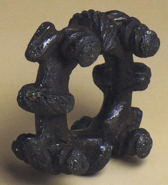 輪の周囲に、二本の巻いた角のある牡羊の頭部を四つ等間隔に配している。斜めに筋を入れた環状部分を挟んで、二頭ずつ向き合っている。指輪としては実用的でないため護符とも考えられる。オッピドゥムで発見された。出所:「古代ヨーロッパの至宝-ゲルト美術展1998」