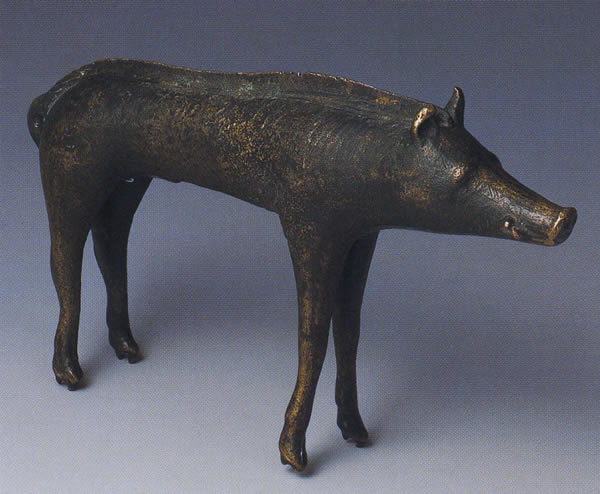 牙・耳などを丁寧に表し、たてがみは小さく休息のポーズである。例えばハンガリーのバータ出土の小像に比べてイノシシの特徴である攻撃性を強調せず、たてがみの文様もない。もとは軍徽章などに装着されていたと考えられる。 1989年にスーラック・シュル・メール(ジロンド、南西フランス)で発見された長さ55cm、高さ28cmのブロンズ製イノシシも、軍徽章の一部であった。出所:「古代ヨーロッパの至宝-ゲルト美術展1998」