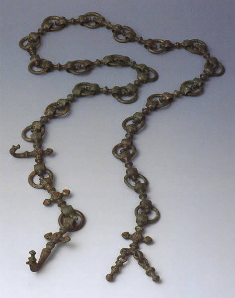 鎖の部品に赤エマーユを施している。おそらくボヘミアで制作されたと考えられる。ボヘミアのオッピダではエマーユの工房跡が発見されており、少なくともボヘミアではエマーユ装飾はオッピダの出現・発展とかかわっている。出所:「古代ヨーロッパの至宝-ゲルト美術展1998」