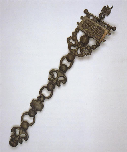 いわゆる「ハンガリー様式」の女性用ベルトのペンダント部分と、環で繋いだその隣接部が残っている。ペンダントの上部は透かし鋳造で、一部に彫刻を施す渦文を表した下部の長方形部分と、一つだけ残存する垂れ飾りにはもとエマーユが施されていた。出所:「古代ヨーロッパの至宝-ゲルト美術展1998」