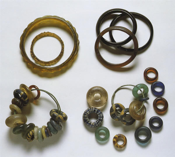 マンドウールのケルトの神域から出土した多数のガラス製装身具から数点を展示する。コバルト青の腕輪。琥珀色の腕輪。ブロンズの輪に通した多数の環状ガラスには、コバルト青に黄色の波状文をあしらうもの、琥珀色、紫色、半透明青緑色、などがある。出所:「古代ヨーロッパの至宝-ゲルト美術展1998」