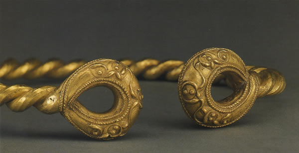 1968-69年にイプスウィッチ近郊の建設工事現場で発見された6点のトルクのうちの1点である。10%の銀と微量の銅を含むだけで、金の純度は比較的高い。面取りを施した二本の棒を巻き付けた輪に、中空の両端をその場で失蝋法によって鋳造した。装飾は鋳造後打ち出しによって施し、唐草文の葉と蕾の中に一つまたは二つの小玉をあしらっている。作業後地の部分を研磨しなかったため、細いガイドラインが今なお残っている。このトルクの形式と装飾はローマの支配下に入る前のブリテン島の特徴を示し、6点のトルクは紀元前75年以前に地中に埋められたと考えられる。出所:「古代ヨーロッパの至宝-ゲルト美術展1998」