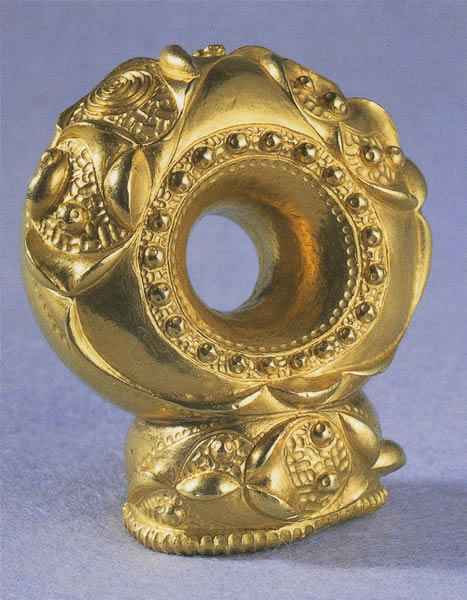 スネッテイスハムのトノレクの最も美しい例と同じように、多数の金線をより合わせた輪を備えたトルクの端末で、失蝋法によって鋳造したあと表面の仕上げを施している。1806年に羊飼いの少年が発見した金ばかりのホードには、同じく東イングランドで制作された、金線をより合わせた輪に環状の端末を付けた小型トルク2点、おそらくアイルランドからもたらされたリボン状トルク、北フランスに由来する球状金貨40数点が含まれていたが、ほとんどが鋳溶かされてしまった。「ホード」は貴重な遺品を多く含む孤立した発見物を指す.出所:「古代ヨーロッパの至宝-ゲルト美術展1998」