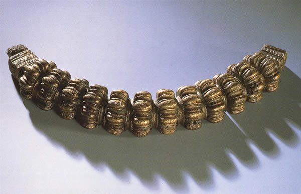 銅合金による珠を別々に作り、溶着し、鉄の輪に通した。このタイプのトルクの最も見事な例はロハー・モス(ダンフリース・アンド・ギャロウェイ、スコットランド)のものであろう。本例は1898年にクランノグ(人工島)の発掘中に発見された。出所:「古代ヨーロッパの至宝-ゲルト美術展1998」