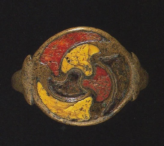 円形の装飾面に、前例と同じく、トリスケーレと三つのトランペット文を配している。当初あった三色のエマーユのうち、赤と黄が残っている。もう一色はおそらく青であった。指輪の形式はローマであるが、装飾は紛れもなくケルトである。出所:「古代ヨーロッパの至宝-ゲルト美術展1998」