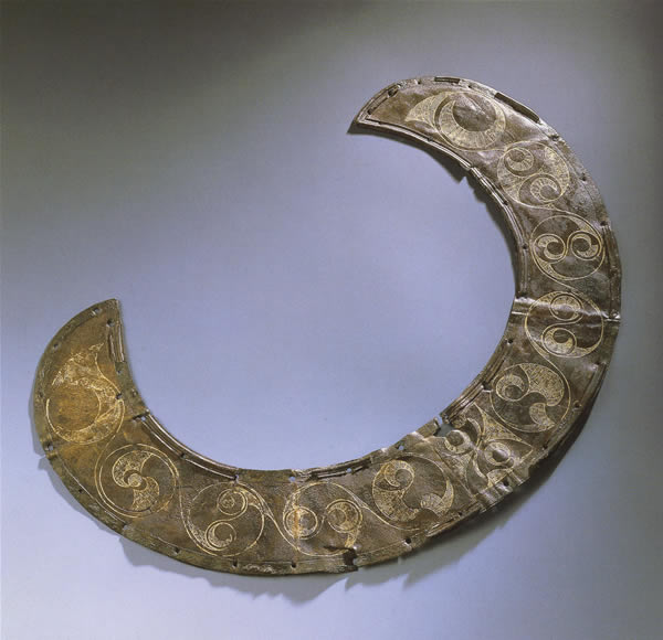 三日月形のブロンズ板の中央の台形にN字形を、その左右の連続S字の中にS字を基本とする装飾を配し、様々な方向のハッチングを施している。 1861年に沼地で発見された際、ブロンズ製鏡、および木箱を装飾していたと考えられるブロンズ裂部品を伴出した。出所:「古代ヨーロッパの至宝-ゲルト美術展1998」