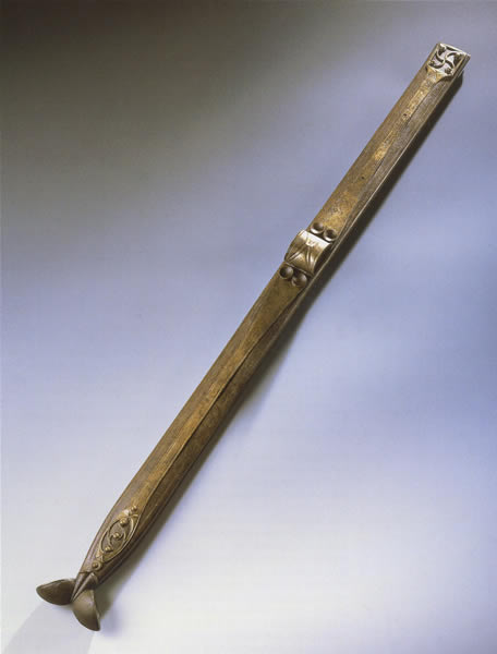 銅合金の板二枚に、鋳造のこじりと、両端の二枚の透かし装飾板、および中央の吊り金具を取り付けている。吊り金具の位置から、この鞘が背中に吊されたことが分かる。出所:「古代ヨーロッパの至宝-ゲルト美術展1998」